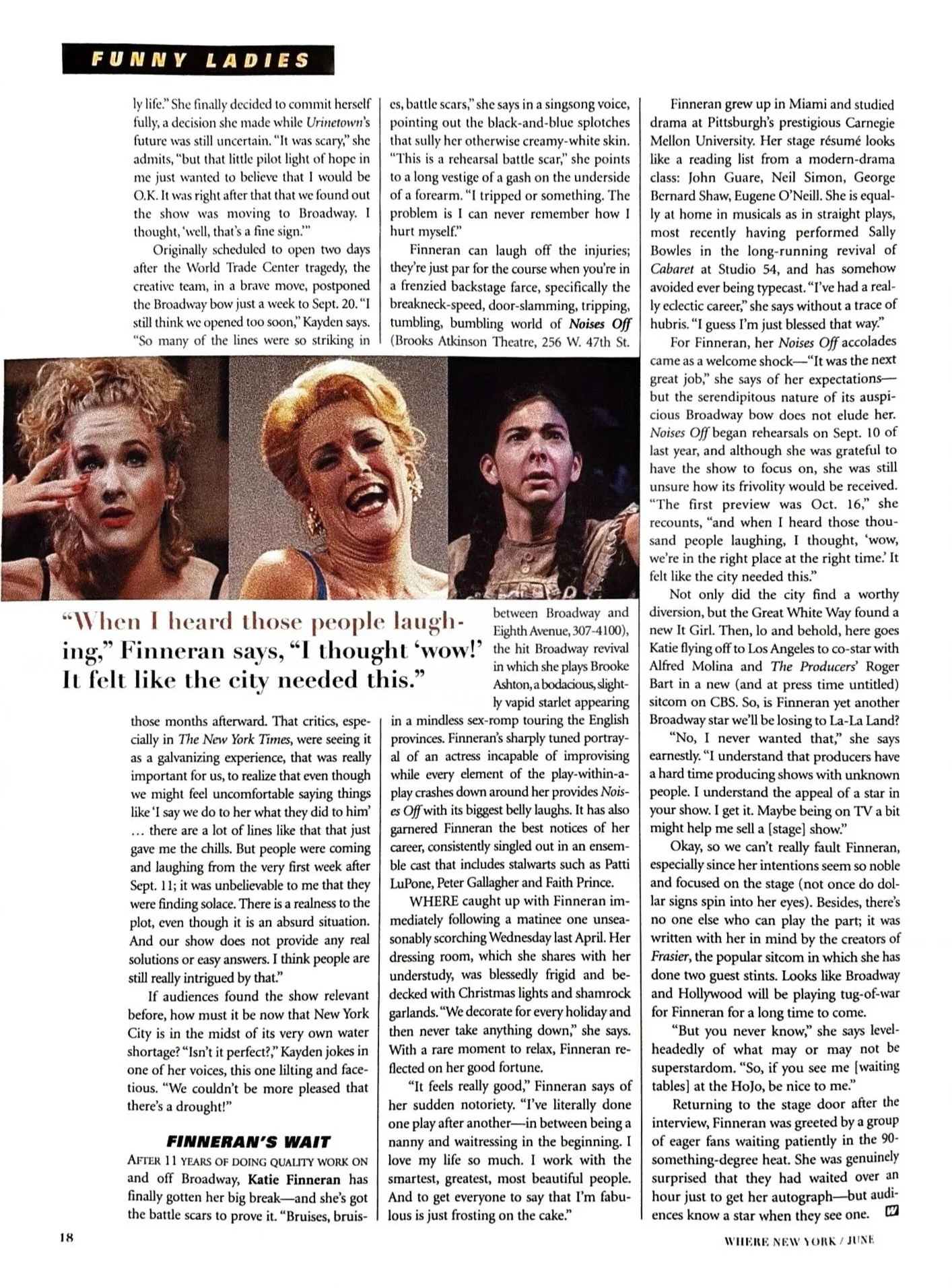 Finneran can laugh off the injuries; they’re just par for the course when you’re in a frenzied backstage farce, specifically the breakneck-speed, door-slamming, tripping, tumbling, bumbling world of Noises Off (Brooks Atkinson Theatre, 256 W. 47th St. between Broadway and Eighth Avenue, 307-4100), the hit Broadway revival in which she plays Brooke Ashton, a bodacious, slightly vapid starlet appearing in a mindless sex-romp touring the English provinces. Finneran’s sharply tuned portrayal of an actress incapable of improvising while every element of the play-within-a-play crashes down around her provides Noises Off with its biggest belly laughs. It has also garnered Finneran the best notices of her career, consistently singled out in an ensemble cast that includes stalwarts such as Patti LuPone, Peter Gallagher and Faith Prince.